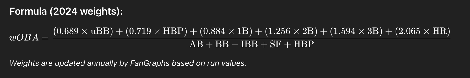 wOBA is an advanced baseball statistic that measures a hitter’s overall offensive contributions per plate appearance by assigning proper weights to different offensive outcomes (e.g., walks, singles, doubles, home runs).
